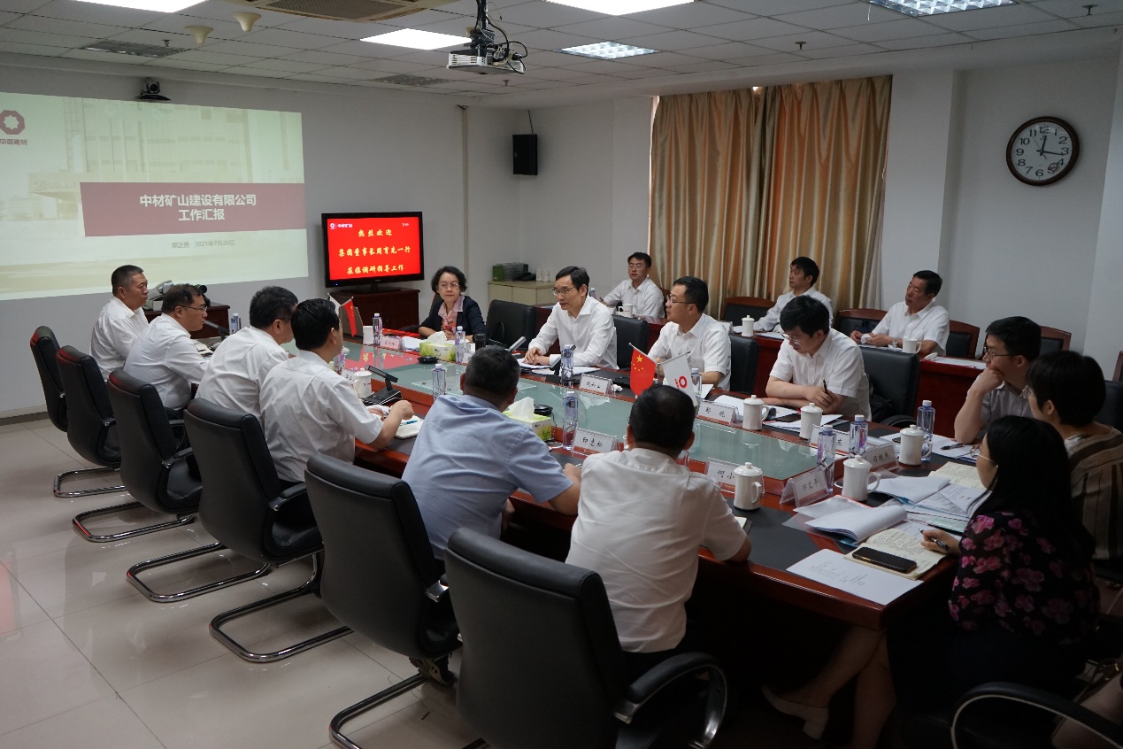 周育先一行聽取了中材礦山總經理郭正勇關于公司總體情況及發展思路的工作匯報及黨委書記劉峰山的補充匯報,充分肯定了中材礦山13年來在生產經營、科技創新、形象建設、黨建引領等方面取得的成績。